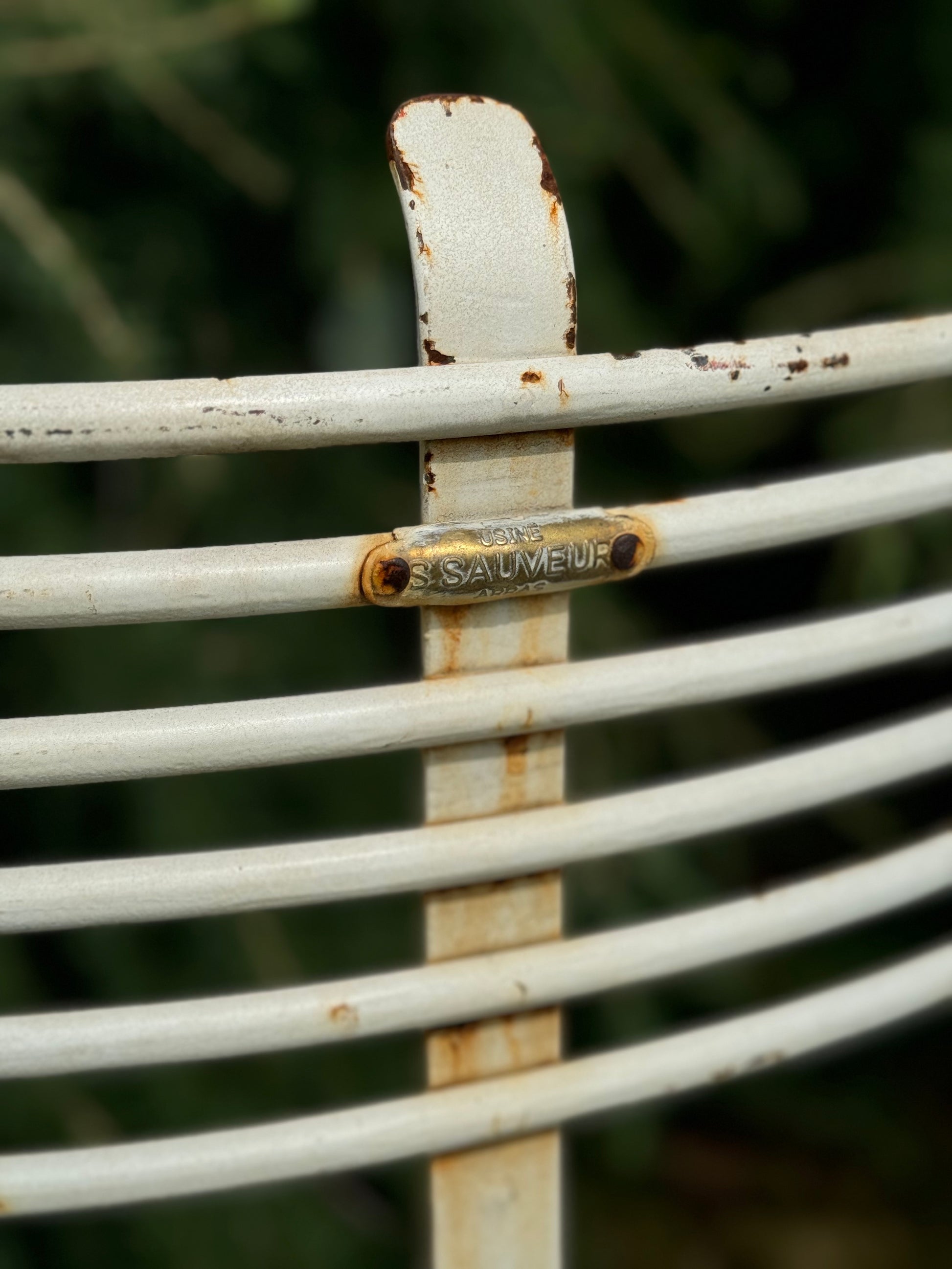 A rare French Arras tree bench, handcrafted in wrought and riveted iron with the signature cast-iron hoof feet and original brass maker’s badge. Beautifully curved to embrace a tree or serve as a garden centerpiece, this piece showcases the distinctive craftsmanship of the late 19th–early 20th century Arras foundries. Aged patina and traces of old paint highlight its authentic vintage character.